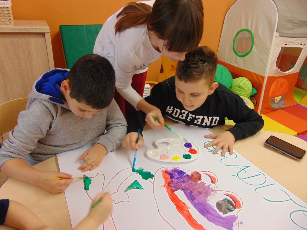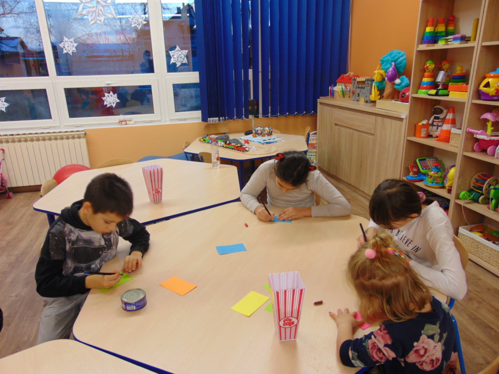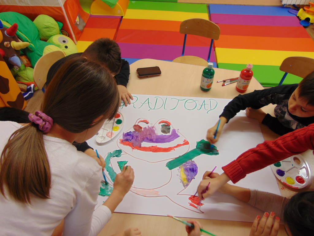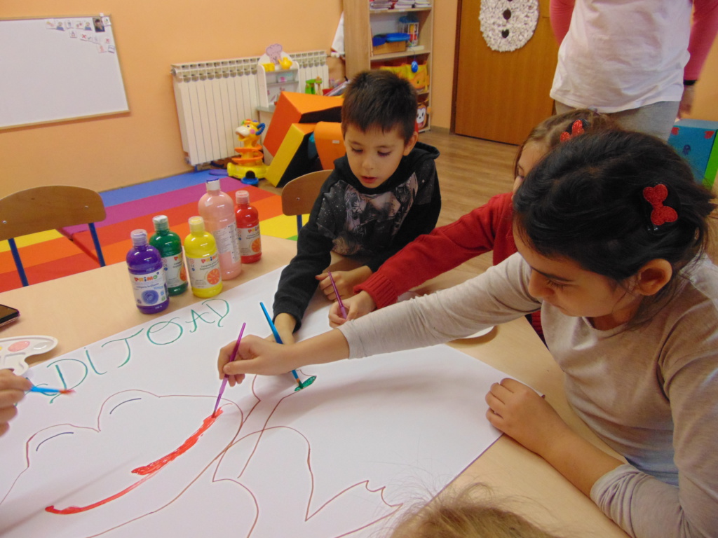 Materijali za radionicu: Hamer papir, tempere, kistovi, papir u boji dimenzije A6, flomasteri. Opis radionice: Dana 13.1.2021. godine u Udruzi Vukovarski leptirići održane su organizirane grupne aktivnosti pod nazivom “Žabica zahvalnosti” za djecu predškolske i školske dobi. Kao uvod u temu, izvoditeljice su najprije potaknule djecu na promišljanje o tome na čemu su sve zahvalni te potaknule razgovor o zahvalnosti. Naučili su što je to zahvalnost, kako tu riječ kažemo na engleskom te su uvidjeli koliko puno postoji stvari na kojima mogu biti zahvalni. Nakon toga izvoditeljice su ispričale kratku dramsku priču o žabici koja je predstavljala pozitivne emocije i zahvalnost te komarcu koji se stalno na nešto žalio pa je predstavljao negativne emocije. Priča završava tako da žabica pojede komarca. Nakon toga djeca su raspravljala o pouci priče te, zajedno s izvoditeljicama, došla do zaključka da zahvalnost pobjeđuje i tjera negativne emocije. Potom su bojali žabicu zahvalnosti temperama te pisala na papiriće u boji poruke o tome na čemu su sve zahvalna.