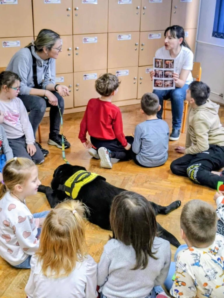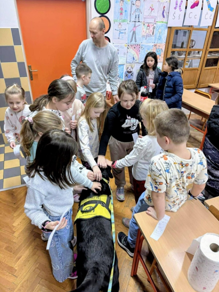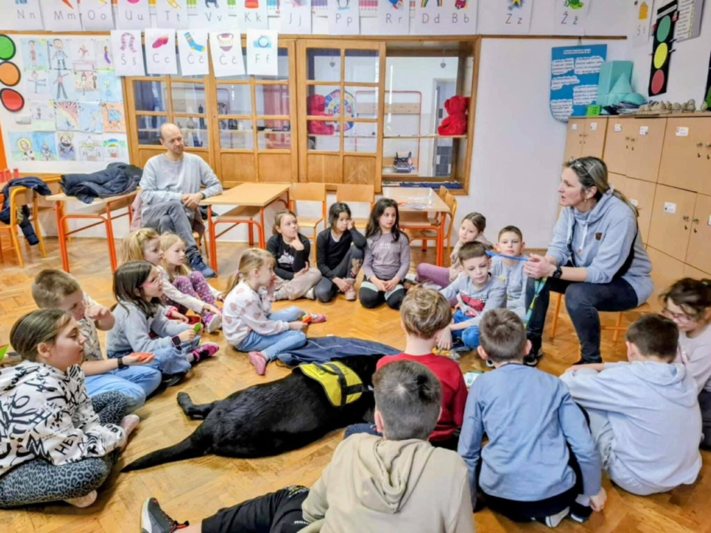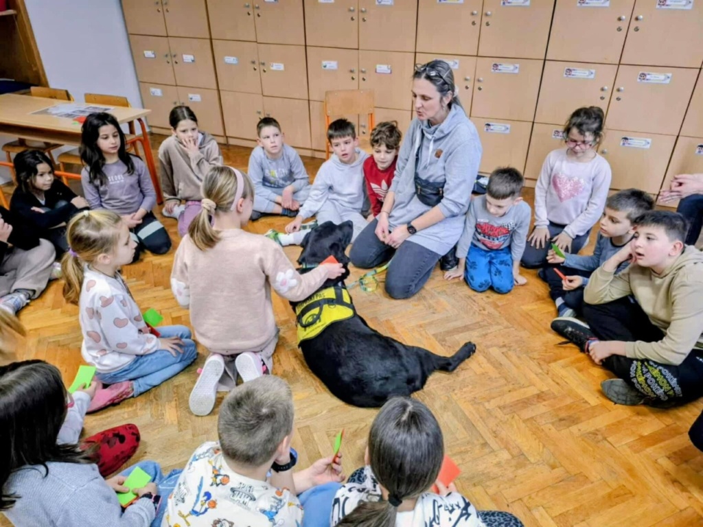Djeca su u učionicu ušla iznimno tiho kako bi upoznala Black-a, a tijekom cijelog susreta vladala je mirna i ugodna atmosfera. Kroz razgovor i vođene aktivnosti učili su kako pravilno i sigurno pristupiti psu, kako se prema njemu ophoditi te što se smije, a što nikako ne smije raditi.